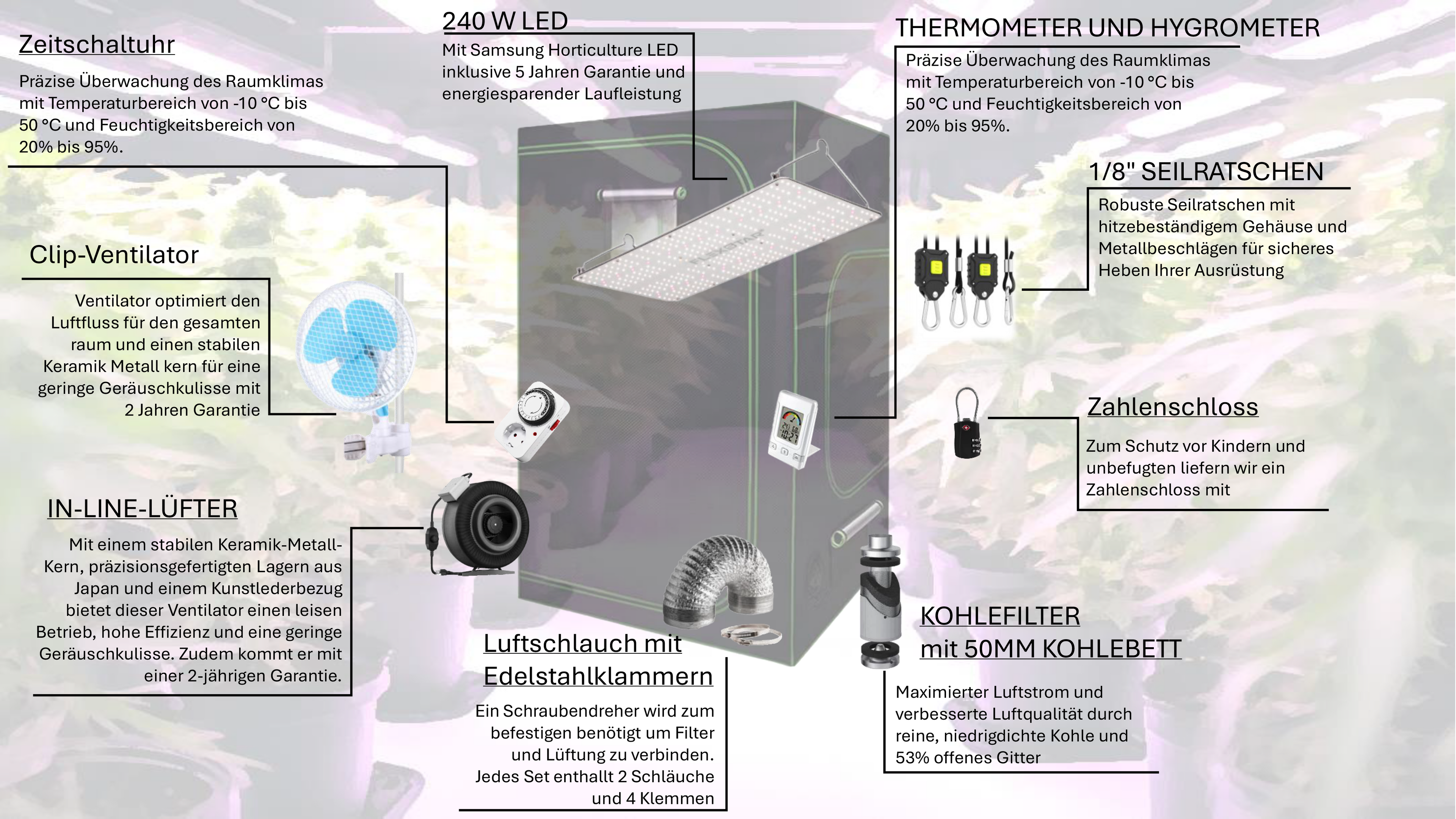 Dieses Set bietet alles für bis zu 3 Pflanzen – mit einer exakt auf die 80 x 80 x 180 cm Growbox abgestimmten 240W LED mit hochwertigen Samsung Chips, einem leistungsstarken Keramik-Lüfter und durchdachter Ausstattung für ein sicheres, effizientes und komfortables Indoor-Grow-Erlebnis.